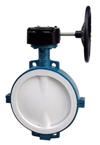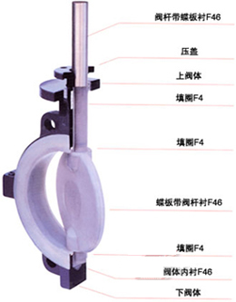 1.其基本類型有兩種,即D71F4和D71F46(中線)全襯里型對夾式蝶閥,采用對分兩片閥體組合,閥座與閥體內(nèi)襯一體化,閥門工作時,只有全塑閥座與襯塑蝶板與介質(zhì)接觸,產(chǎn)品可承受“除熔融堿金屬和元素氟”外的任何介質(zhì)腐蝕,其中D71F46閥桿與蝶板(鍛)為一體,表面均勻包覆一層FEP。閥體通道內(nèi)表面光滑,流體阻力小,CV值高,流通能力強,扭矩適中,采用四級密封結(jié)構(gòu)并在密封面外配以耐溫抗老化的SI橡膠的彈性襯墊閥座,完全達到介質(zhì)的零泄漏。