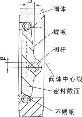 蝶板的回轉(zhuǎn)中心(即閥桿的中心)與蝶板密封截面偏置一個尺寸α,并與閥體通道軸線偏置一個尺寸β。